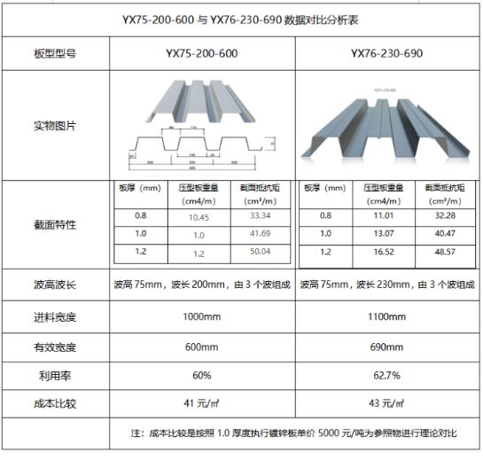 YX75-200-600與YX75-230-690這兩種開口樓承板板型進行比較,它們有什么區(qū)別呢首先,它們的展開寬度。YX75-200-600開口樓承板的展開寬度是一米,而YX75-230-690的展開寬度是一米一。從用鋼的效率上來說,后者的稍微高一點。不過對于樓承板板型來說,決定他本身的是慣性矩和支撐的跨距,最重要的指標是肋高和波距。這兩個板型比較,其中肋高是一樣的,波距的話是600更加密一點,所以它適合項目的支撐跨距更加大,結(jié)構(gòu)上更加安全。